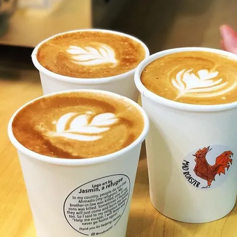 Support a good cause with our Barista Coffee Cart, where each drink features a unique logo hand-colored by refugees in Asia, helping to create livelihoods and sharing their stories on our coffee cups. Enjoy expertly crafted beverages like Honey Butter Latte, Mocha, and Sea Salt Chocolate, complemented by delicious baked goods such as Chocolate Babka and Nutella Stuffed Cookies. Your purchase helps pay for refugee art, making every sip meaningful. Customizable logo stickers on disposable cups also available.