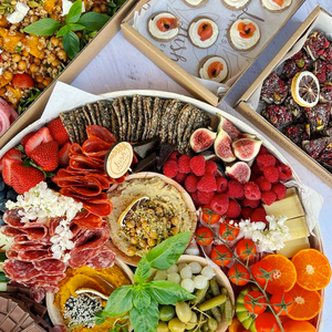 Indulge in our Cheese Platter Box, featuring seven cheeses including Camembert, Truffle Gouda, and Truffle Brie. Enjoy four types of fine charcuterie: Champagne, Prosciutto, Salami, and Shaved Honey Baked Ham. Complemented by six light bites like seasonal fruits, olives, veggie sticks, nuts and chocolate, honeycomb, and crackers. Packaged for immediate use, with canapés available upon request. Perfect for impressing guests with a gourmet spread.