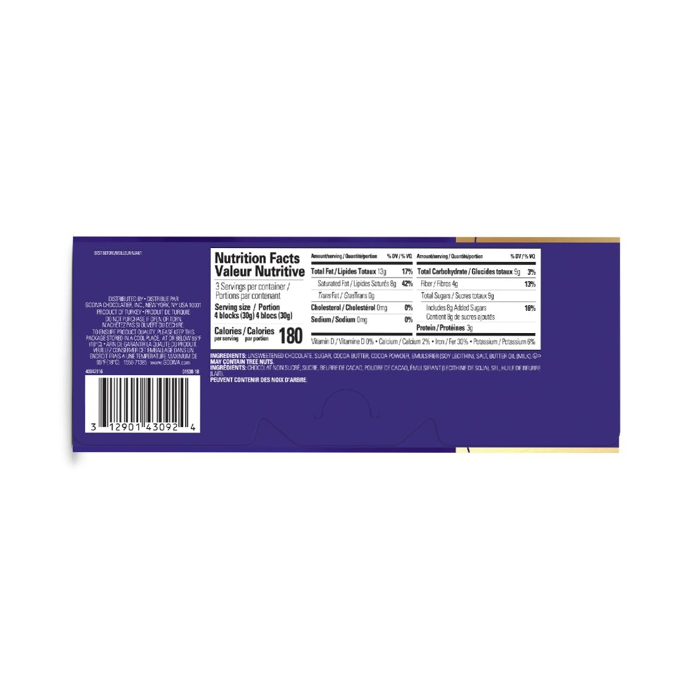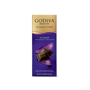The classic 72% Dark Chocolate Bar is sure to delight any true chocolate lover. The taste of intense 72% dark chocolate offers a luxuriously smooth flavour experience with a fruity cacao finish. GODIVA tablets are large enough to share or to keep as a special treat all for yourself. Each bar is scored into delicious bite-sized pieces with a curved shape.