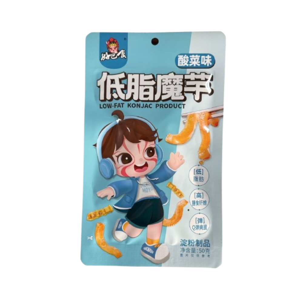 These konjac strips are infused with the tangy and savoury flavour of traditional Chinese sauerkraut. Their chewy texture complements the umami-rich seasoning for a satisfying snack experience. Low in calories and high in fibre, they make a healthy alternative to typical chips. The 50g size is perfect for snacking anytime, anywhere. Enjoy the nostalgic taste of pickled vegetables in a modern, convenient form.
