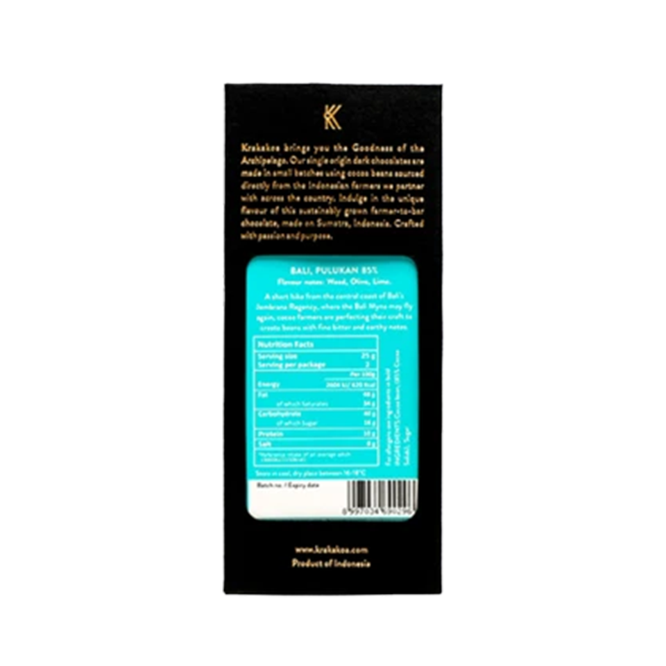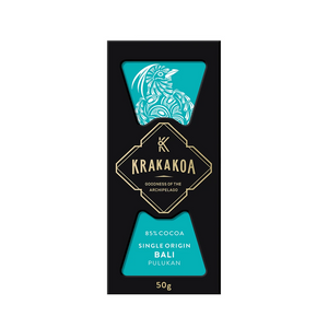 Imported from Indonesia, Krakakoa believes that farmers need to make a good living from the hard work that they do and that the environment needs to be protected. This seed to table concept ensures that this 85% Sumatran cocoa is at its purest. Krakakoa's cacao beans are organically grown and sourced from small farms that practice sustainable farming methods, and their partner farmers are paid more than the Fairtrade Minimum price for their harvest. These organically grown, farmer-to-bar chocolate products, are made with passion and purpose. This 85% Arenga dark chocolate is a complex bar with the robust natural acidity of fermented cocoa and complex earthy aromas.