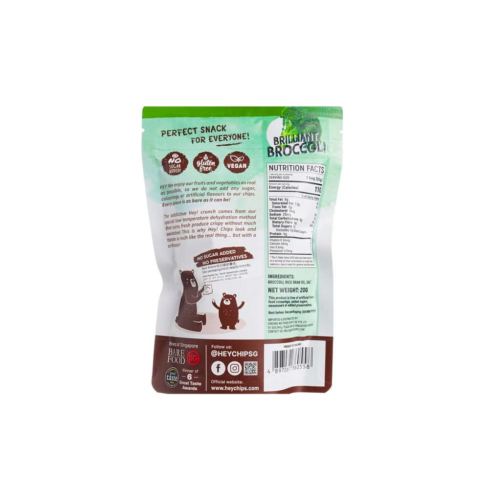 Vibrant, crunchy, and naturally savoury, these award-winning broccoli chips turn wholesome florets into an unexpectedly addictive snack. Made with real broccoli, a dash of salt, and rice bran oil, they’re crafted using a NASA-adopted low-temperature dehydration method to preserve flavour, texture, and nutrients — without added sugar or preservatives. Vegan, gluten-free, Halal-certified, and dietitian-approved, they’re rich in Vitamin K and choline to support brain health, and perfect for lunchboxes, study breaks, or as a crisp, flavourful salad topping. Snack smart. Crunch happy. Say Hey!