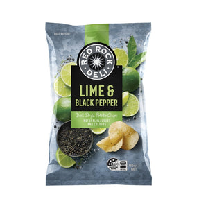 Red Rock Deli Lime & Black Pepper Chips offer a zesty combination of freshly ground peppercorns and tangy lime. Crafted from Australian potatoes, roughly cut and slow-cooked for a delectable crunch.