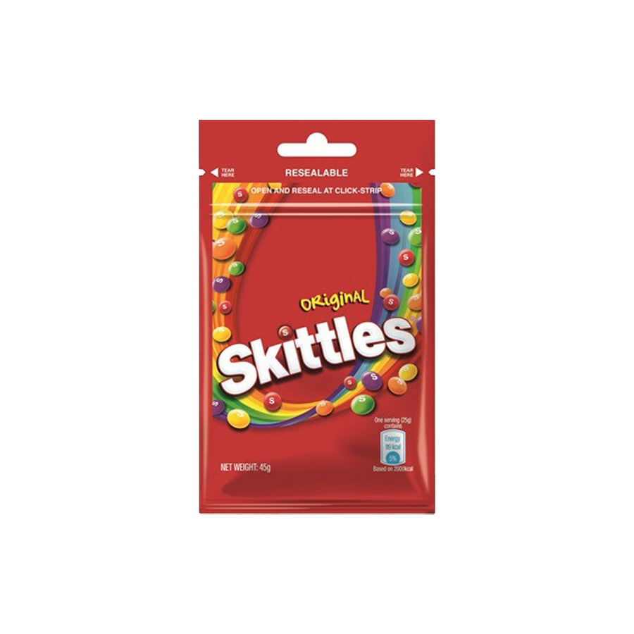 Every pack of SKITTLES gives you the chance to Taste the Rainbow, with a variety of fruit flavours almost too good to be true. Flavours include strawberry, green apple, grape, lemon, and orange.