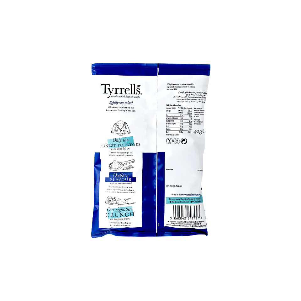 Tyrrells Lightly Sea Salted Potato Chips are a classic choice for anyone who enjoys a simple yet satisfying snack. The chips are beautifully crispy, showcasing a perfect golden-brown color that hints at their quality. The lightly salted flavor enhances the natural taste of the potatoes without overwhelming it, making them ideal for those who prefer a more subtle seasoning.